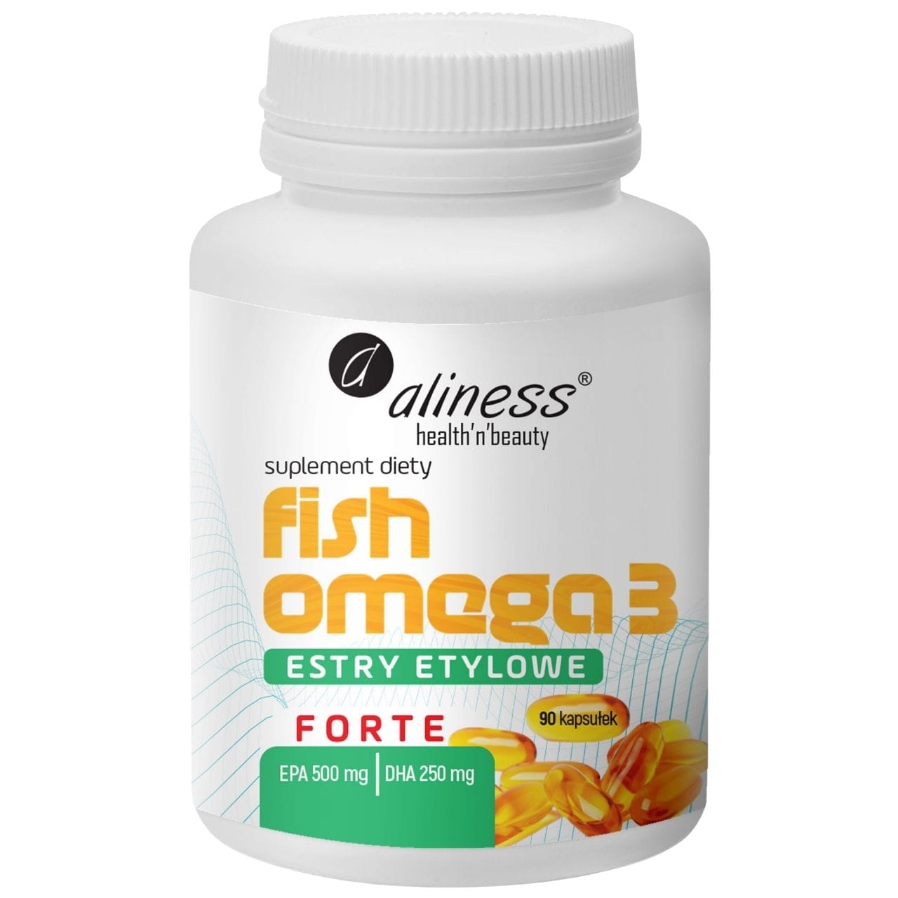 Aliness Fish Omega 3 Forte 500/250 mg is a dietary supplement in soft capsules containing fish oil in the form of ethyl esters. One serving (2 capsules) provides 1500 mg of omega-3 acids, including EPA (1000 mg) and DHA (500 mg). EPA and DHA contribute to the proper functioning of the heart. DHA contributes to the proper functioning of the brain and the maintenance of normal vision. Ethyl esters enable a high concentration of omega-3 acids. Package 90 capsules = 45 days of use. Contains fish.