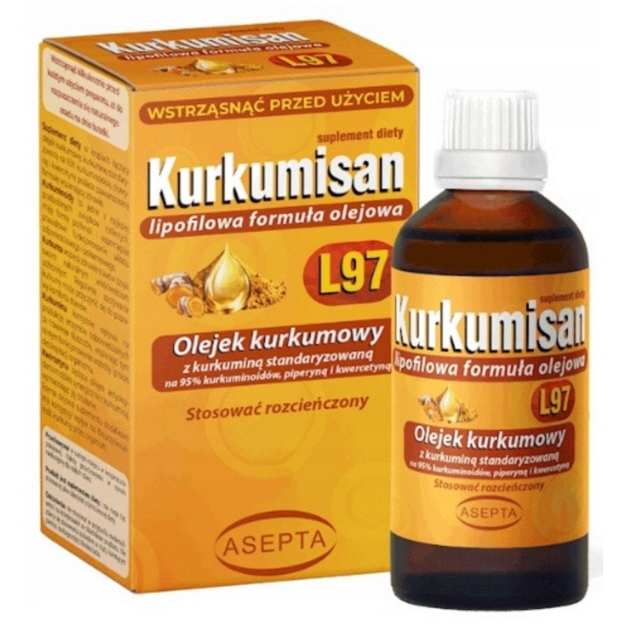Asepta Kurkumisan Ulei de curcuma este un supliment alimentar sub formă de picături . Conține ulei din rizomi de curcumă ( Curcuma longa ) , extract de curcumă standardizat la 95% curcuminoide , extract de piper negru standardizat la 95% piperină , quercetin și mangan în ulei de măsline extravirgin. Formula este îmbogățită cu ulei de măceșe. Doza zilnică: 5 picături de 2-3 ori pe zi . Nu conține: gluten , lactoză , OMG-uri , coloranți artificiali.