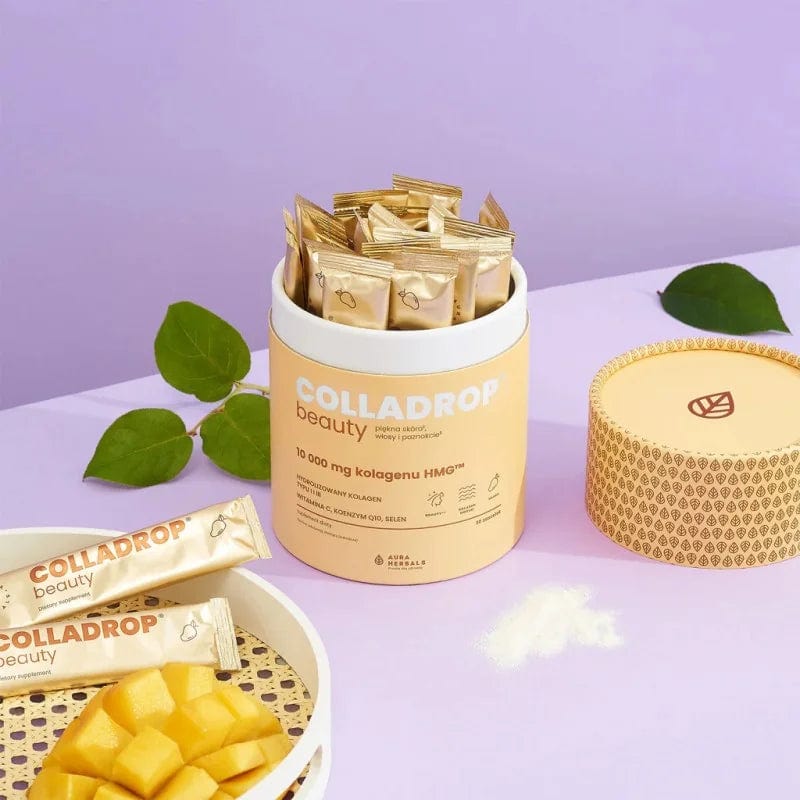 Colladrop ® Beauty, un colagen HMG™ de Aura Herbals, este un supliment alimentar sub formă de pudră cu aromă de mango care conține colagen marin hidrolizat tipurile I și III, precum și coenzima Q10, seleniu și vitamina Quali ® -C a mărcii.