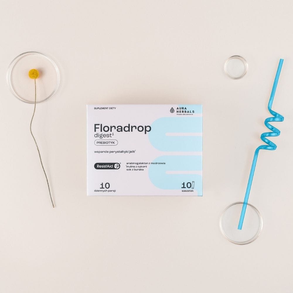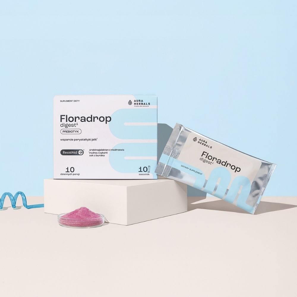 Aura Herbals Floradrop digest este un supliment alimentar sub formă de pulbere în pliculețe practice. O sursă naturală de prebiotice . Conține extract de larice americană (Larix laricina) standardizat la 85% arabinogalactan (ResistAid ®). Cu adaos de inulină din cicoare și suc de sfeclă roșie.