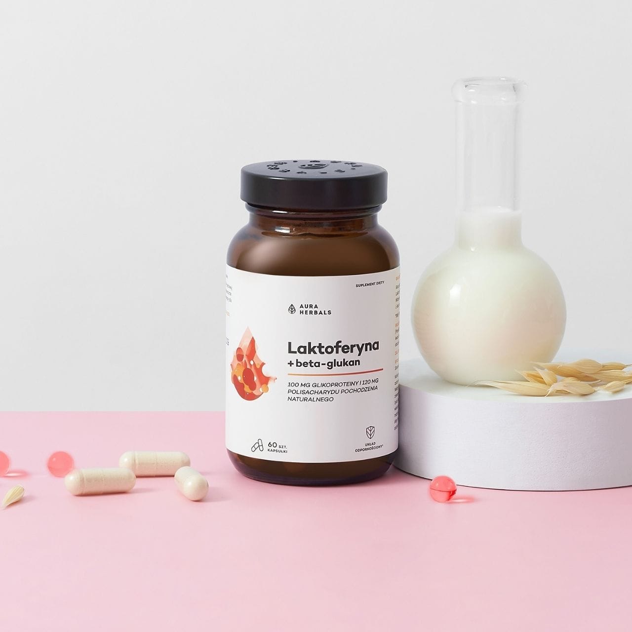 Aura Herbals Lactoferina + Beta-Glucan este un supliment alimentar în capsule vegetale care conține PromOat ® beta-glucan din ovăz ( 120 mg ) , lactoferină din lapte ( 100 mg ) , și vitamina C ( 40 mg = 50% RDA ) . Vitamina C contribuie la funcționarea normală a sistemului imunitar . Produsul este în conformitate cu conceptul „clean label” – fără coloranți artificiali sau conservanți. Capsulă HPMC. Pachet de 60 capsule = 60 zile de utilizare . Conține lapte și ovăz.