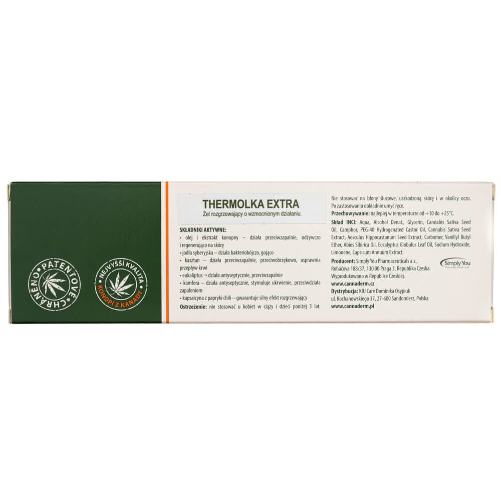 Gel încălzitor pentru dureri musculare și articulare cu efect sporit. Conținutul de cânepă a crescut la 16% (Thermolka în versiunea de bază conține 6% ulei de cânepă). Ameliorează durerile cronice de spate și articulare, reduce rigiditatea articulară și musculară.