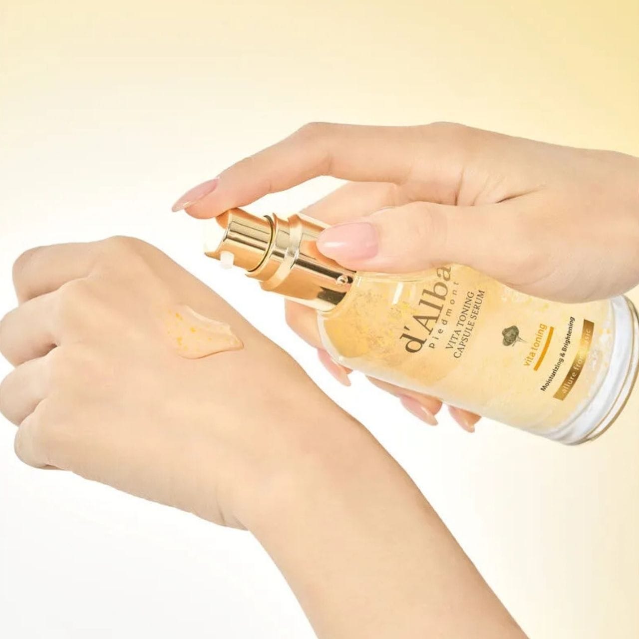 Serum D'Alba Vita Toning cu formulă revoluționară pe bază de apă pură de cătină care oferă pielii energie naturală din vitamine. Cele 40,000 de capsule de vitamine unice eliberate în timpul aplicării oferă o nutriție intensivă și un efect de iluminare imediat. Complexul avansat Vitality combină ingrediente active hidratante, regenerante și anti-îmbătrânire, care acționează sinergic din interior spre exterior. Formula este delicată, dar extrem de eficientă. - Rezultatele clinice dovedite arată o iluminare vizibilă a pielii, minimizarea decolorării și netezirea liniilor fine după doar două săptămâni de utilizare regulată. Serul este vegan, certificat V-Label și potrivit chiar și pentru pielea sensibilă. Ingrediente pe care le veți îndrăgi: