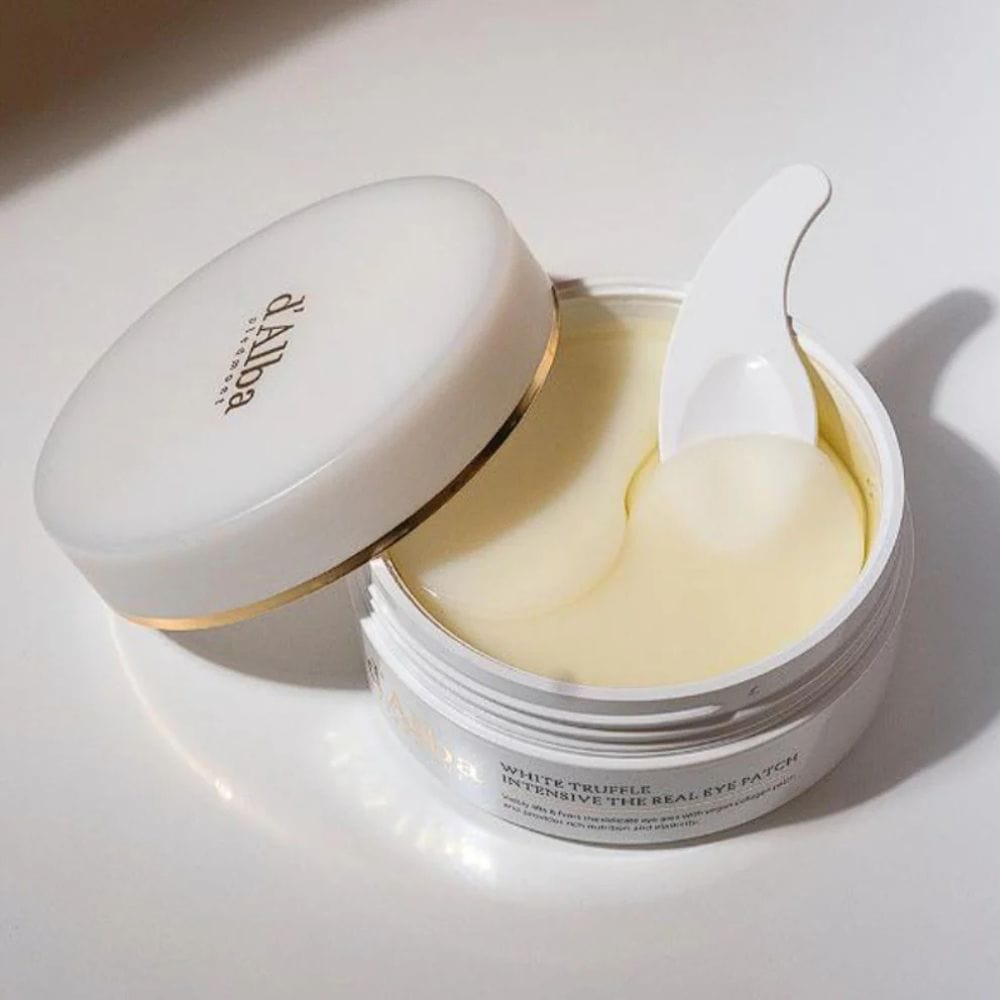 D'alba Pateuri intensive pentru ochi cu trufe albe pateuri de lux pentru ochi cu hidrogel conținând 1,73 ppm extract de trufe albe și colagen. Formula inovatoare cu fermenti și 7 uleiuri naturale din plante hidratează intens, luminează cearcănele și reduce liniile fine. Textura flexibilă a gelului aderă perfect la piele, eliberând treptat ingredientele active. După 40-50 de minute, tampoanele devin translucide, semnalând absorbția completă a nutrienților.