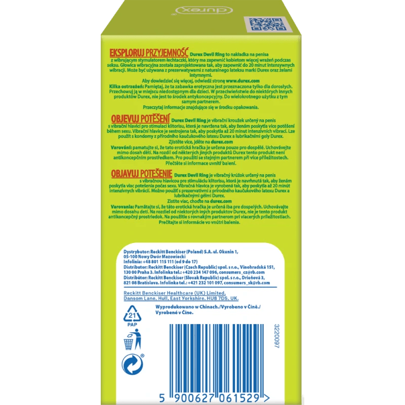 Durex Devil Ring este un tampon pentru penis cu stimulator clitoridian vibrator conceput pentru a oferi femeilor mai multă senzație în timpul sexului. Capul vibrator este conceput pentru a oferi până la 20 de minute de vibrații intense . Poate fi folosit cu prezervative din latex natural de marcă Durex și geluri intime.