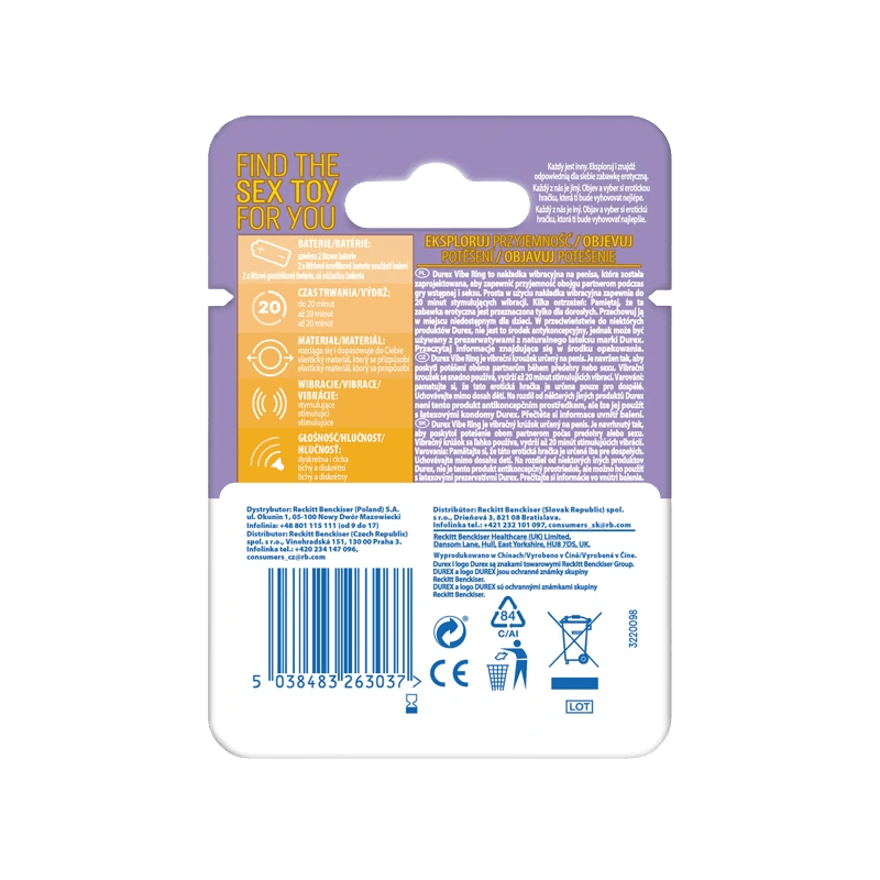 Durex Intense Vibrations este un pad de masaj de dimensiuni mici sub forma unui inel vibrator. Este un mic gadget erotic care poate aduce o anumită gură de aer proaspăt în orice dormitor, dar se poate dovedi și un gadget interesant și util pentru utilizare regulată. Cu o singură utilizare, poate dura până la 20 de minute oferind o experiență de neuitat pentru ambii parteneri prin emiterea de vibrații blânde și puternice în același timp. Este un produs oferit de liderul mondial în categoria produselor care îmbogățesc viața sexuală - brandul cunoscut și respectat Durex. Inelul este fabricat din produse sigure de cea mai înaltă calitate. Aspectul acestui topper poate fi discret și neremarcabil. Cu toate acestea, acest inel vibrator este o parte a unei serii de gadgeturi erotice care vă permit să îmbunătățiți senzațiile, să întăriți sentimentul de plăcere și să combateți în mod eficient plictiseala din viața sexuală. Cu utilizarea capacului, plăcerea poate fi simțită mai puternic și mai clar, ceea ce se traduce în cele din urmă în creșterea calității vieții sexuale .
