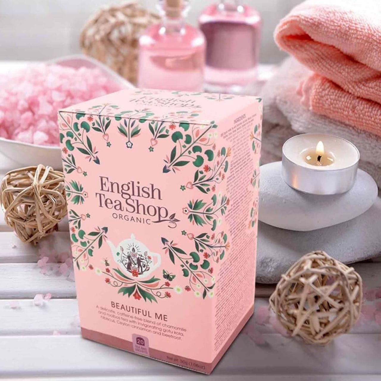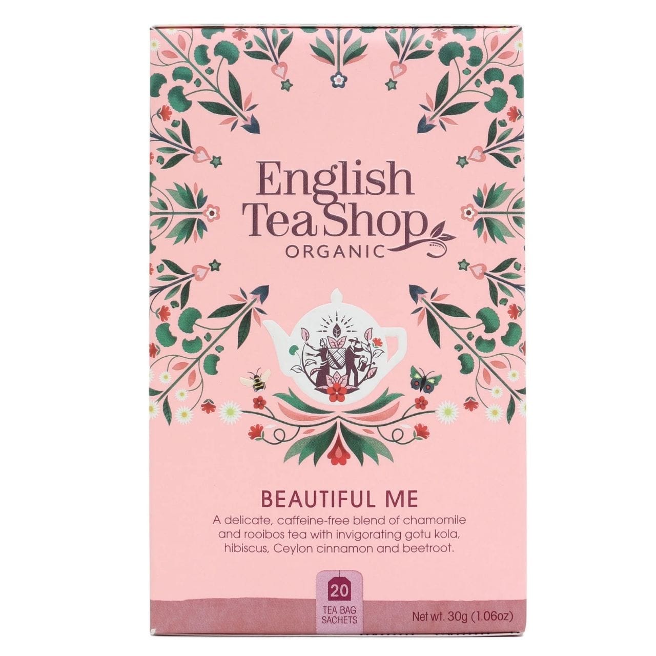 Simțiți-vă frumoși din interior! English Tea Shop Beautiful Me este un amestec organic fără cofeină , care combină mușețelul blând cu gotu kola curățant.