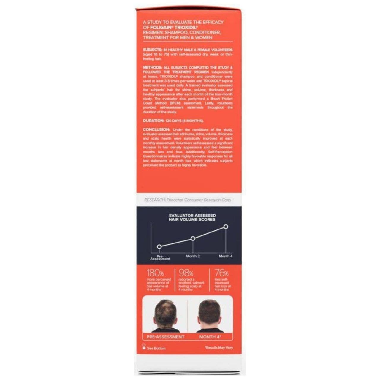 Șamponul FOLIGAIN reprezintă cele mai recente progrese în lupta împotriva alopeciei androgenetice . Ingredientul cheie este complexul brevetat Trioxidil ® într-o concentrație de 2%, a cărui eficacitate a fost confirmată în studii clinice riguroase. Rezultatele sunt impresionante: creștere cu 180% a volumului părului după 4 luni, reducere cu 76% a căderii părului în aceeași perioadă, și îmbunătățire cu 75% a densității după doar 2 luni de utilizare.