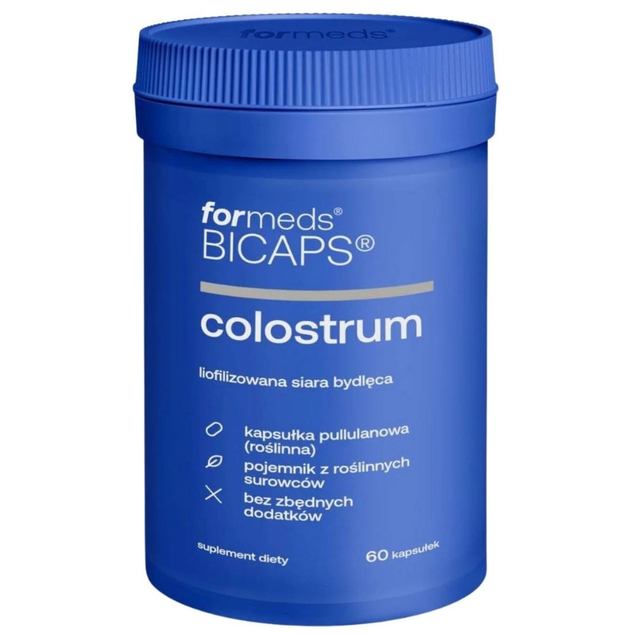 Formeds Bicaps Colostrum este un supliment alimentar sub formă de capsule. Este o sursă de Colostrum, bovin liofilizat, obținut în primele 24 de ore după naștere. Acest lucru asigură păstrarea stabilității și activității biologice complete. Colostrum standardizat pentru imunoglobuline (30%), lactoferină (2,5%) și polipeptide bogate în prolină (2%).