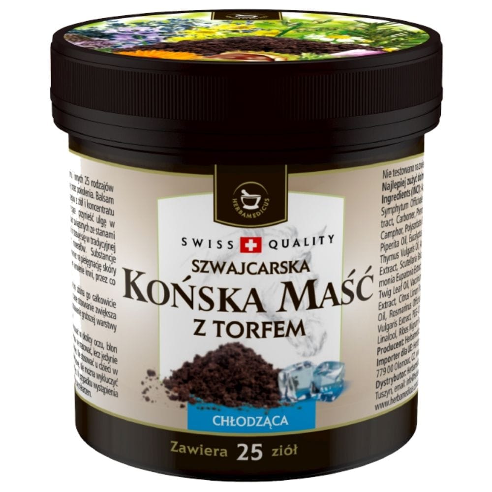 Herbamedicus Unguent pentru cai cu turbă Răcoritor este un balsam unic pe bază de plante creat din turbă de înaltă calitate și 25 de extracte de plante . Formula, bazată pe o rețetă tradițională, oferă o senzație imediată de răcorire și aduce o ameliorare a durerii.