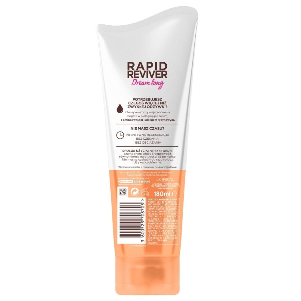 L'Oreal Elseve Rapid Reviver Dream Long este un balsam concentrat inovator, pentru părul lung și deteriorat. Acesta oferă o transformare expresă a părului datorită unei formule bogate în ser de aminoacizi și ulei de ricin. Acesta oferă o regenerare de 2 ori mai puternică decât un balsam clasic, este absorbit instantaneu în păr și nu îl încarcă. Ideal pentru îngrijirea zilnică, redă vitalitatea și protejează părul de rupere.