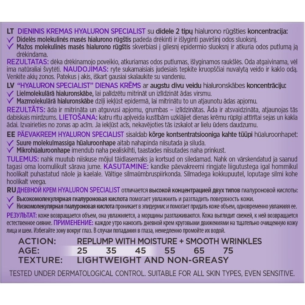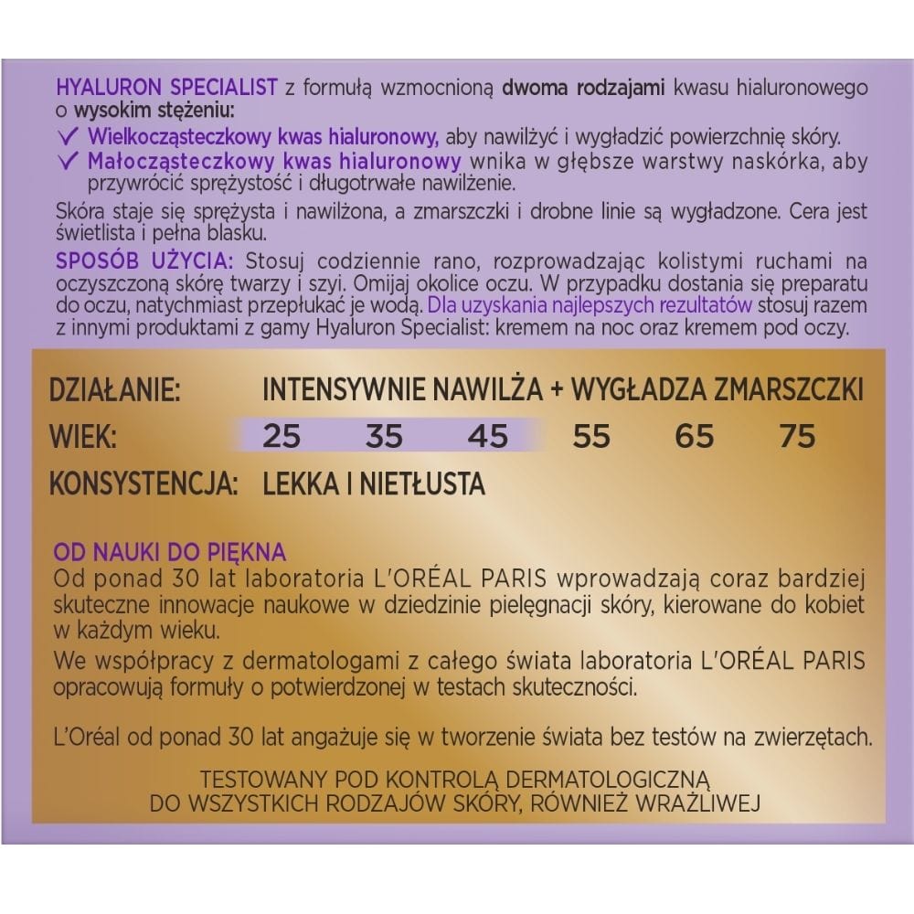 Hyaluron Specialist cremă hidratantă de zi este un produs inovator dezvoltat de Laboratoarele L'Oréal Paris ca parte a îngrijirii sale hidratante restauratoare. Acesta răspunde nevoilor femeilor care doresc să își păstreze pielea tânără și proaspătă, combătând eficient primele semne ale îmbătrânirii și oferind protecție împotriva razelor nocive ale soarelui.