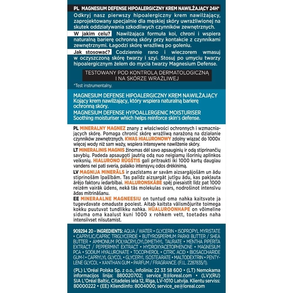 L'Oréal Paris Men Expert Magnesium Defense Hypoallergenic Moisturising Cream este o cremă intens hidratantă special formulată pentru bărbații cu pielea sensibilă. Datorită conținutului său de magneziu și acid hialuronic, crema calmează, hidratează și întărește bariera naturală a pielii pentru a o proteja de poluare și iritații, în special după bărbierit.
