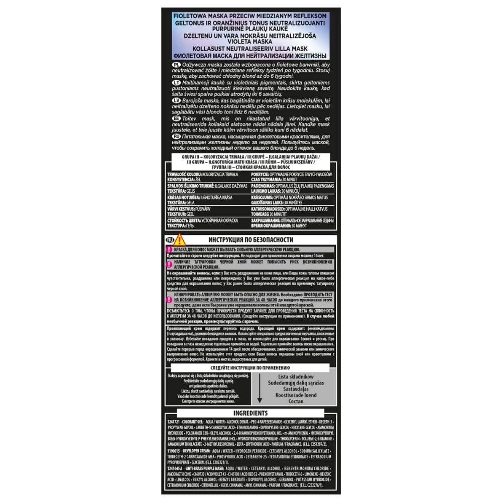 Gel colorant: Aqua/Water, Trideceth-2 Carboxamide Mea, Propylene Glycol, Hexylene Glycol, PEG-2 Oleamine, Polyglyceryl-4 Oleyl Ether, Oleyl Alcohol, Alcohol Denat., Hidroxid de amoniu, Poligliceril-2 Oleil Eter, Acid oleic, Diethylaminopropyl Cocoaspartamide de sodiu,2,4-Diaminophenoxyethanol HCl, m-Aminophenol,2-Amino-3-Hydroxypyridine, Metabisulfit de sodiu, Hydroxypropyl Bis (N-Hidroxietil-P-Fenilendiamină) HCl, Eugenol, Acetat de amoniu, Linalool, p-Fenilendiamină, Alfa-Isometil Iononă, Resorcinol, EDTA, Citronellol, Acid Eritorbic, Parfum/Fragrance. (FIL C201769/1).