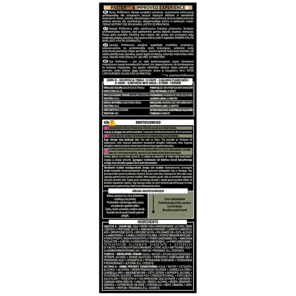 L'Oréal Paris Preference este o vopsea de păr permanentă inovatoare, cu un sistem anti-decolorare. Noua formulă gel cu ulei oferă până la 8 săptămâni de culoare, intensă și strălucitoare și până la 100% acoperire a părului cărunt. Produsul oferă rezultate profesionale la domiciliu, este gata de clătit în doar 25 de minute și conține un balsam de protecție a strălucirii îmbogățit cu filtru UV și derivat de vitamina E.