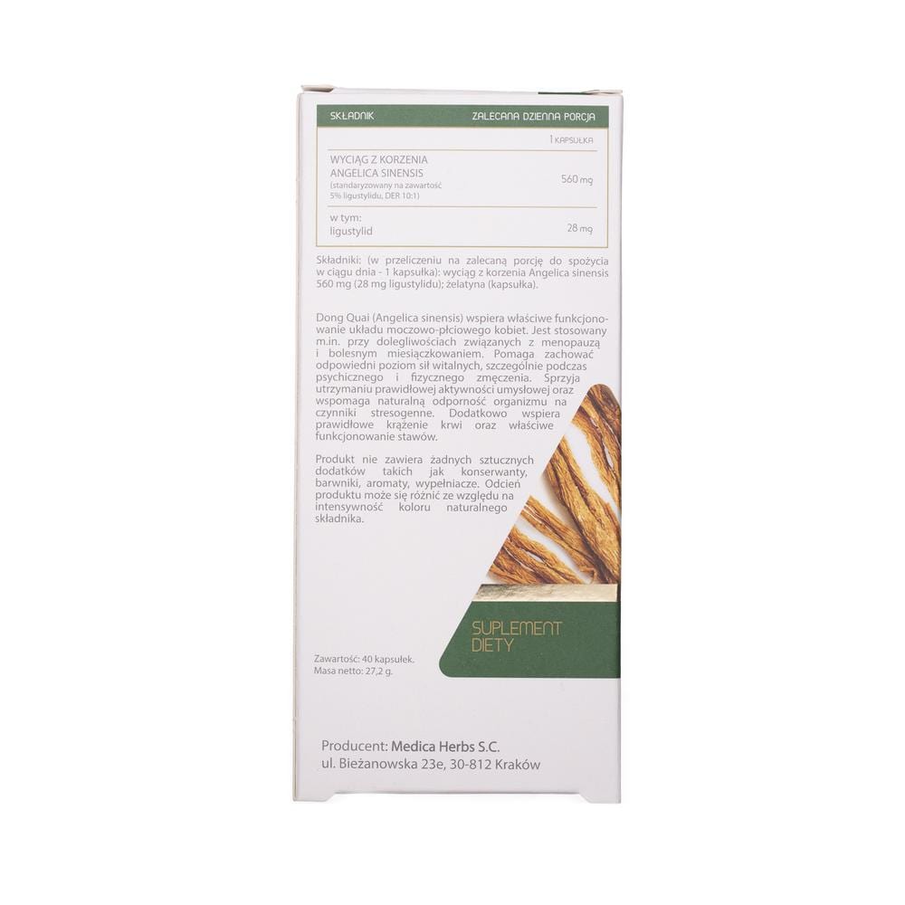 Medica Herbs Dong Quai este un supliment alimentar sub formă de capsule, care conține un extract standardizat de 5% ligustilidă derivată din rădăcina de Angelica sinensis. Dong Quai, cunoscut și sub denumirea de Angelica sinensis, este o plantă utilizată în mod obișnuit în medicina tradițională chineză pentru potențialele sale beneficii pentru sănătate. A fost studiat pentru capacitatea sa de a susține sănătatea femeilor, în special în timpul menopauzei.