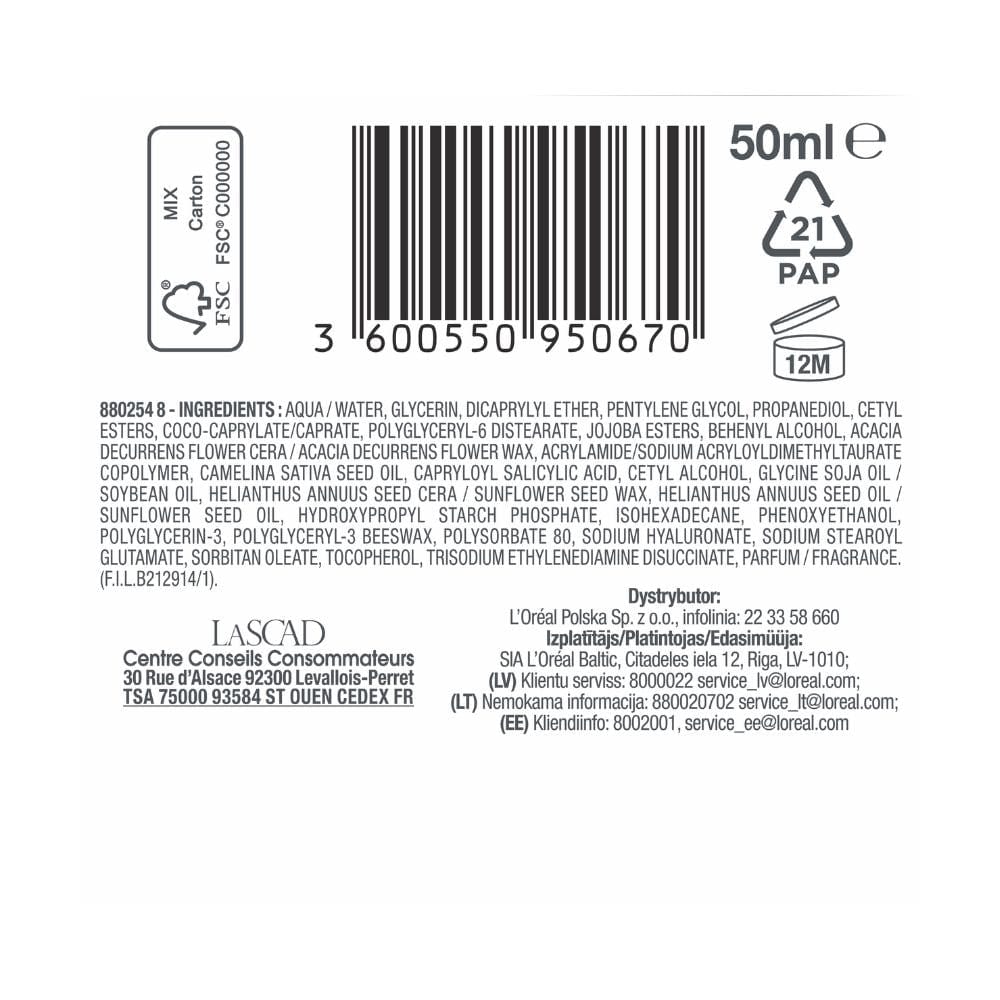 Aqua / Apă, Glicerină, Dicaprylyl Ether, Pentylene Glycol, Propanediol, Cetyl Esters, Coco-Caprylate/Caprate, Polyglyceryl-6 Distearat, Esteri de Jojoba, Alcool behenilic, Acacia Decurrens Flower Cera / Ceara de flori de Acacia Decurrens, Copolimer de acrilamidă/ Acriloildimetiltaură de sodiu, Ulei de semințe de Camelina Sativa, Acid capriloil salicilic, Alcool cetilic Alcohol, Glycine Soja Oil / Soybean Oil, Helianthus Annuus Seed Cera / Sunflower Seed Wax, Helianthus Annuus Seed Oil / Sunflower Seed Oil, Hydroxypropyl Starch Phosphate, Isohexadecane, Phenoxyethanol, Polyglycerin-3, Poligliceril-3 Ceară de albine, Polisorbat 80, Hialuronat de sodiu, Stearoil Glutamat de sodiu, Sorbitan Oleat, Tocoferol, Trisodium Ethylenediamine Disuccinate, Parfum / Fragrance.