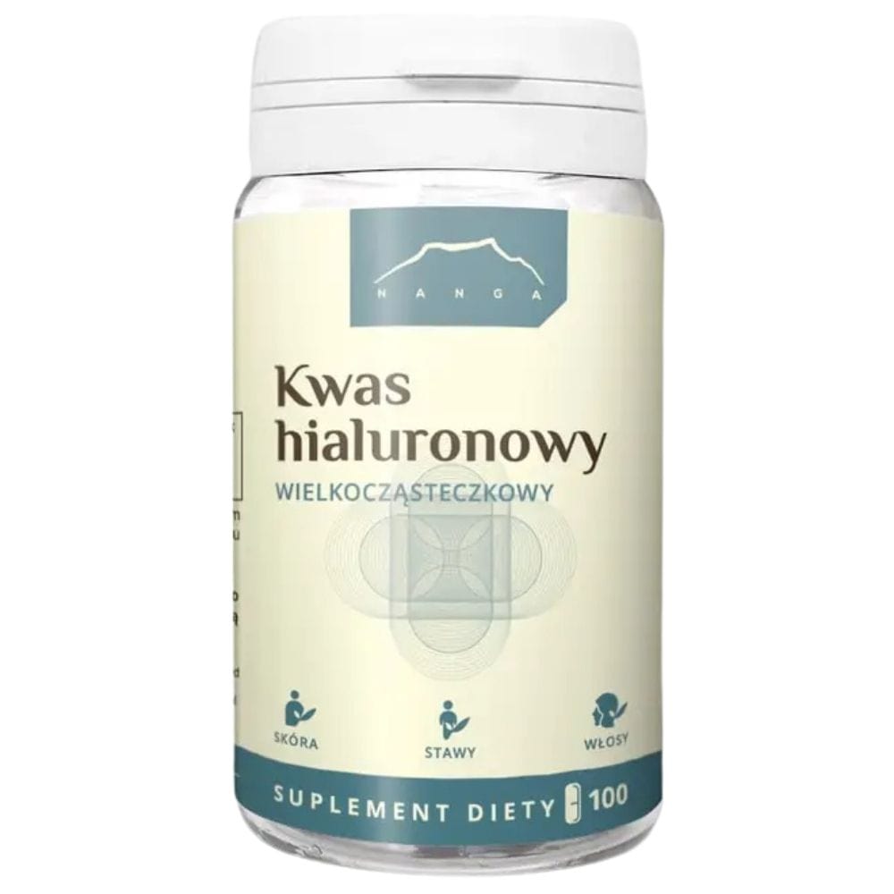 Nanga Acid hialuronic cu molecule mari este un supliment alimentar sub formă de capsule, fără aditivi și agenți de umplere inutili. Conține 200 mg de hialuronat de sodiu într-o capsulă, obținut prin fermentarea glucozei de către Streptococcus zooepidemicus.