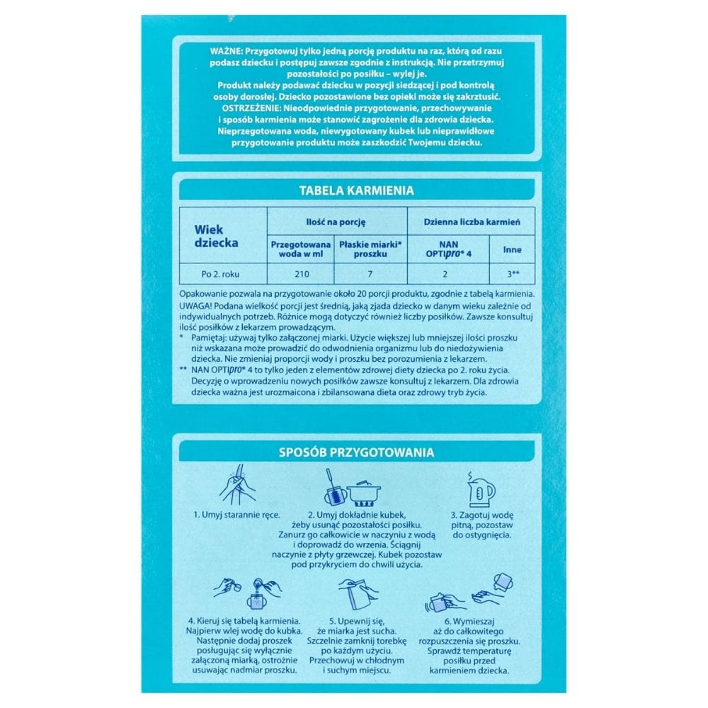 Nestle NAN OPTIpro 4 este un produs pe bază de lapte destinat copiilor mici cu vârsta peste 2 ani. Îmbogățit cu vitamine și minerale. Nu este un substitut pentru laptele matern, ci un produs conceput pentru a facilita compoziția adecvată a dietei unui copil.