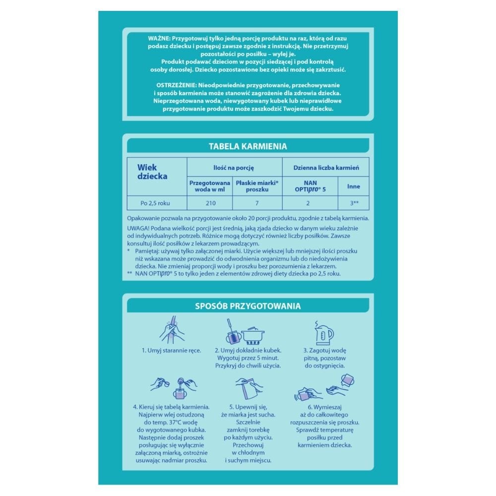 Nestle NAN OPTIpro 5 este un produs pe bază de lapte destinat copiilor mici cu vârsta peste 2,5 ani. Îmbogățit cu vitamine și minerale. Nu este un substitut pentru laptele matern, ci un produs conceput pentru a facilita compoziția adecvată a dietei unui copil.