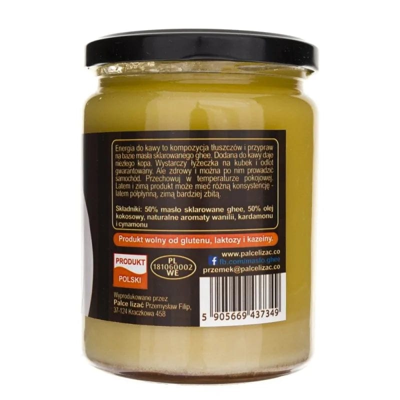 unt ghee 80% clarificat, ulei de cocos, arome naturale de vanilie, cardamom și scorțișoară.