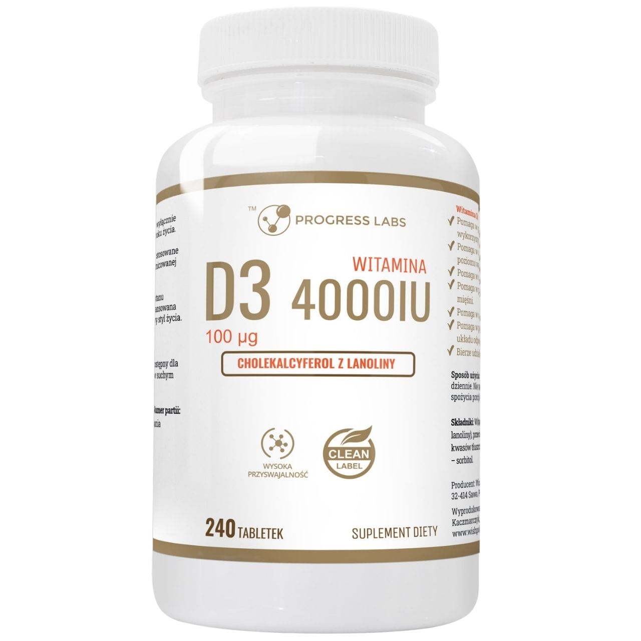 Progress Labs Vitamina D3 4000 UI este un supliment alimentar sub formă de comprimate care conține 100 µg ( 4000 UI , 2000% RDA ) de colecalciferol obținut din lanolină. Vitamina D contribuie la menținerea sănătății oaselor și dinților , la absorbția normală a calciului și fosforului , la menținerea nivelului normal de calciu în sânge , la funcționarea normală a sistemului imunitar și la funcționarea normală a mușchilor. Comprimatele nu conțin gluten , soia , lactoză și OMG-uri. Pachet de 240 comprimate.