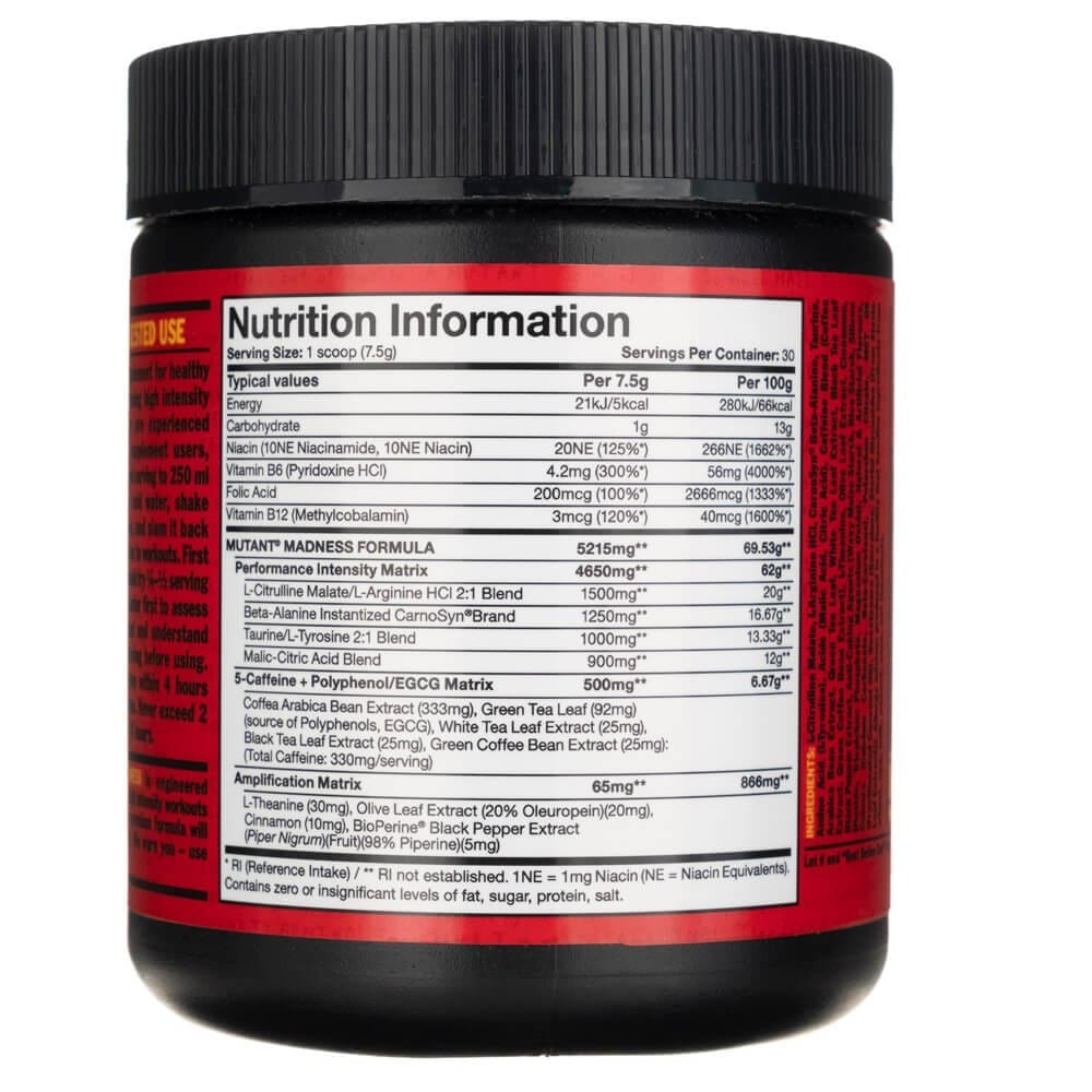 PVL Mutant Madness este un supliment alimentar sub formă de pudră formulat pentru antrenamente de cea mai mare intensitate. Mutant Madness conține arginină, citrulină, beta-alanină și mai multe ingrediente premium pentru a susține cel mai bine fiecare dintre antrenamentele tale.