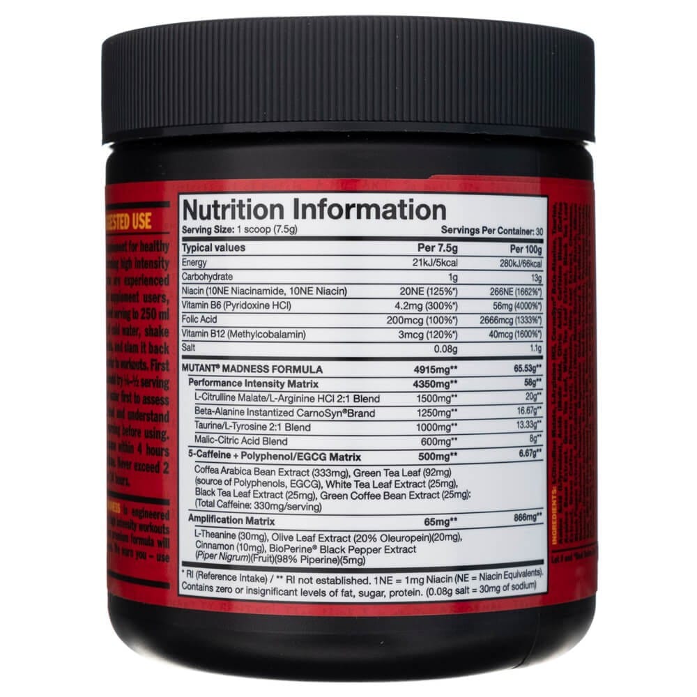 PVL Mutant Madness este un supliment alimentar sub formă de pudră formulat pentru antrenamente de cea mai mare intensitate. Mutant Madness conține arginină, citrulină, beta-alanină și mai multe ingrediente premium pentru a susține cel mai bine fiecare dintre antrenamentele tale.
