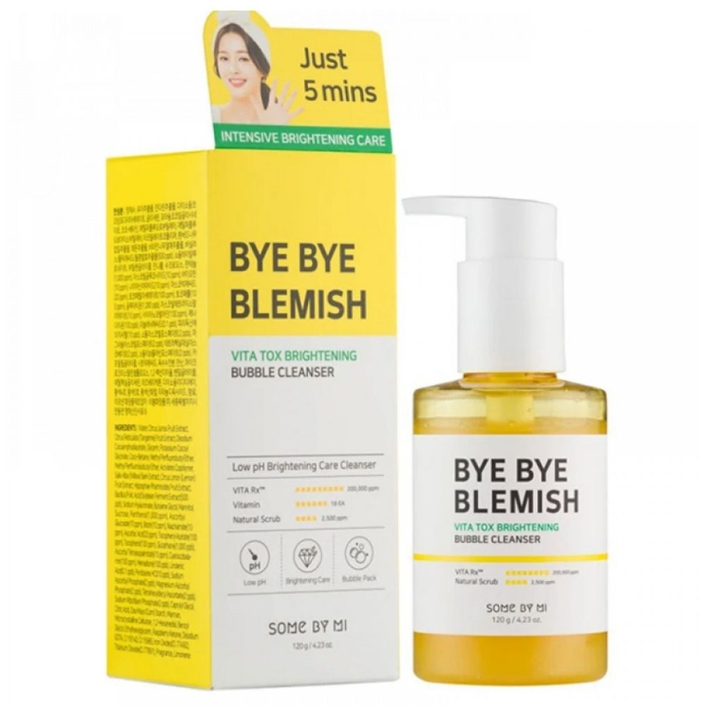 Some by Mi Bye Bye Blemish Vita Tox Brightening Bubble Cleanser este o spumă de curățare inovatoare cu un complex de 18 vitamine. Formula cu bule de hidrogen curăță delicat și luminează pielea, reducând decolorarea și oferindu-i o strălucire sănătoasă.
