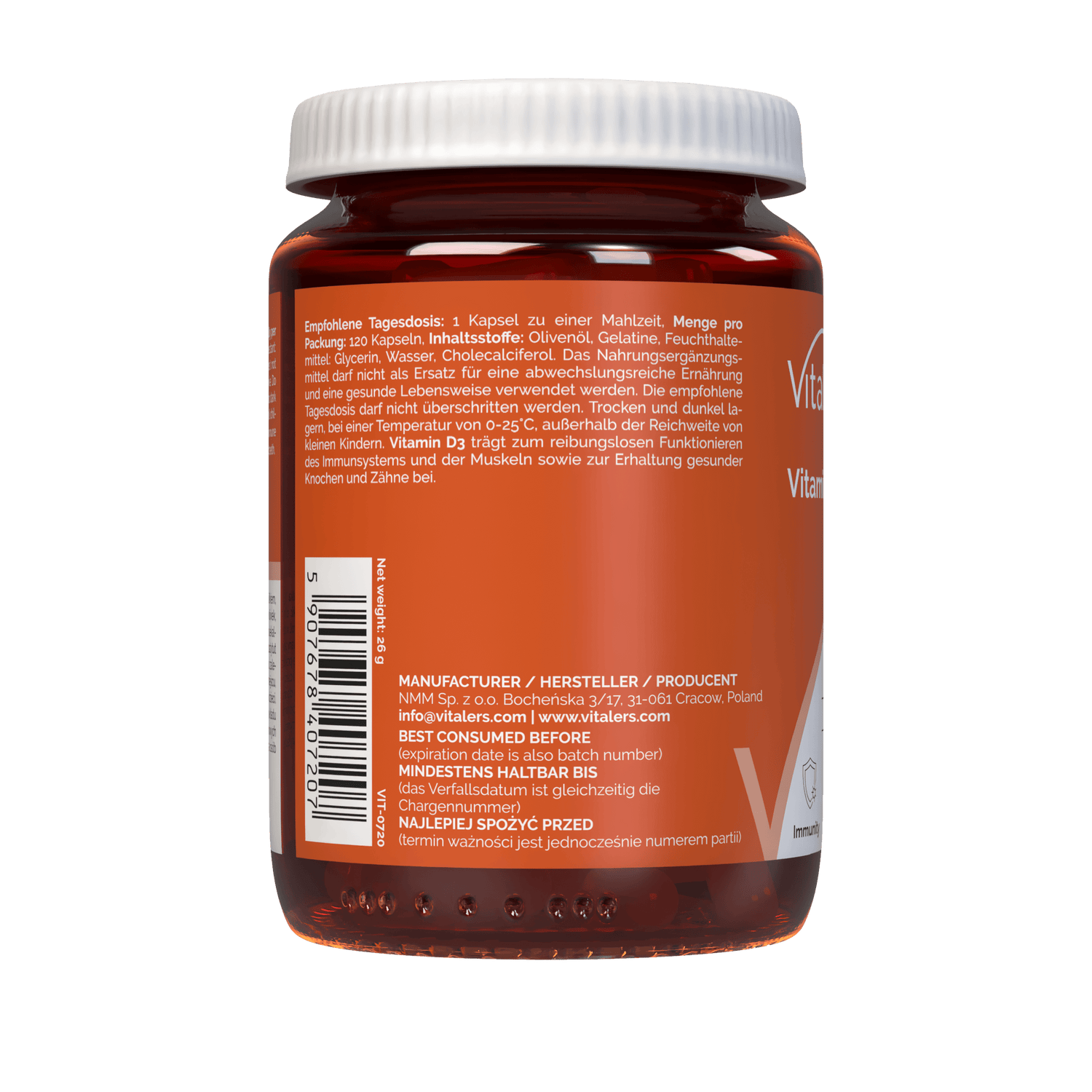 Vitaler's Vitamina D3 4000 UI este un supliment alimentar în capsule care conține vitamina D3 derivată din lanolină. Vitamina D ajută la buna funcționare a sistemului imunitar, mușchilor, și la menținerea sănătății oaselor și dinților.